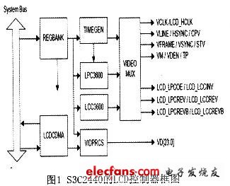 S3C2440芯片集成了TFT LCD的驱动器(图1),因此本文采用了256k色240×320的TFT真彩LCD,所以LCD接口的设计就相对简单(图2)。LCD接口用一个41Pin插座,包含了常见LCD所用的大部分控制信号(行场扫描、时钟和使能等),和完整的RGB数据信号(RGB输出为8:8:8)。同时还有一个跳线的设计方便支持不同的LCD工作电压。